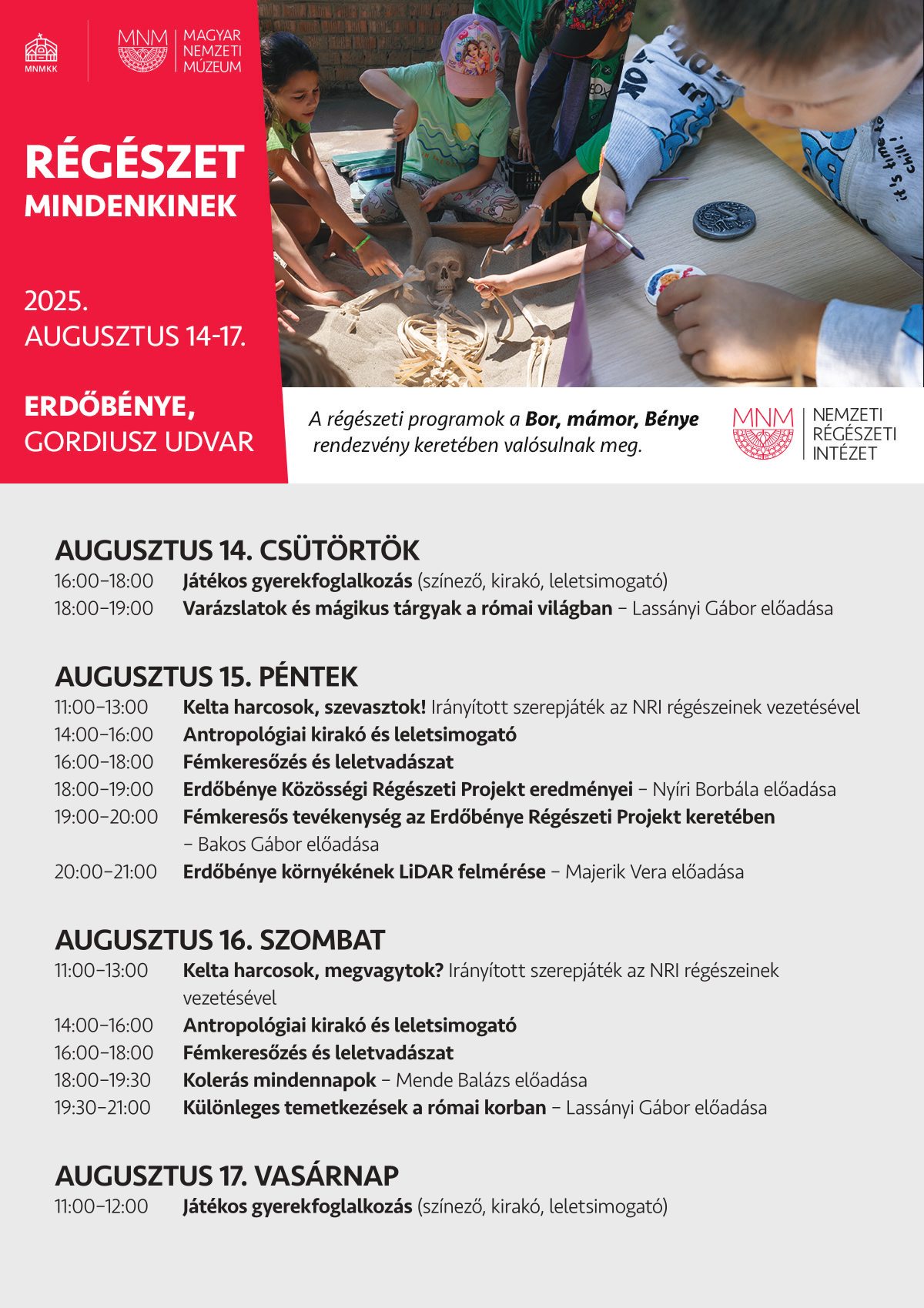 A múlt nem poros vitrin: élő történet, amely akkor válik a miénkké, ha kézbe vesszük, kérdezünk róla és megtapasztaljuk. A Bor, Mámor, Bénye program részeként, augusztus 14-17. között az MNMKK Magyar Nemzeti Múzeum Nemzeti Régészeti Intézetének csapata épp ezt kínálja: játékos, mégis tudományos belépőt a történelembe – kicsiknek és nagyoknak egyaránt.